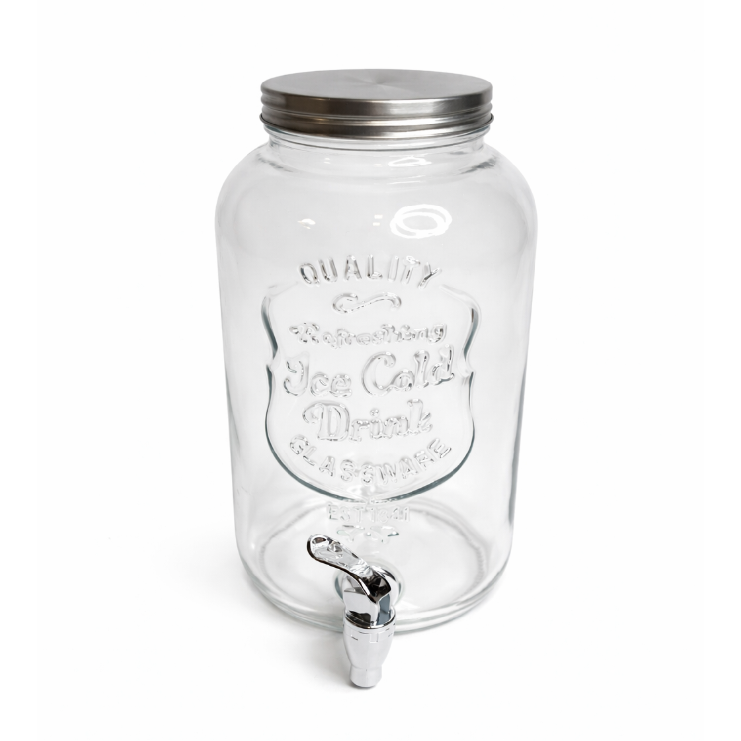 Das klare Glasdesign mit geprägter Schrift verleiht dem Getränkespender einen charmanten Vintage-Look und fügt sich harmonisch in verschiedenste Dekorationskonzepte ein. Der Schraubdeckel aus Metall schützt den Inhalt vor Verunreinigungen, während der Zapfhahn ein sauberes und einfaches Ausschenken ermöglicht.